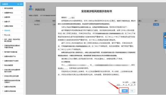 二、發票使用—風險告知,進入雙向實名認證模塊(此處只顯示當前登錄人員的信息,所以需要給誰做雙向實名認證,則需要使用該人員的信息驗證登錄),點擊【本人確認】。