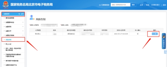 請您點擊【我要辦稅】—【發票使用】—【風險告知】進入雙向實名認證模塊(此處只顯示當前登錄人員的信息,所以需要給誰做雙向實名認證,則需要使用該人員的信息驗證登錄);點擊【本人確認】后彈出“實名制涉稅風險提示告知書”,確認信息后點擊【相符】則可進行生物識別驗證;在生物識別驗證界面可使用“北京稅務APP/個人所得稅APP”掃描二維碼進行人臉識別,人臉識別成功后點擊【確定】即可。