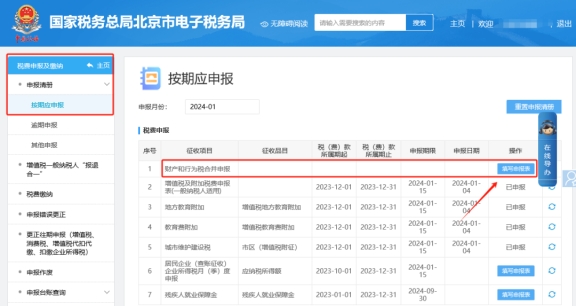二、稅費申報及繳納—申報清冊—按期應申報—財產和行為稅合并申報。