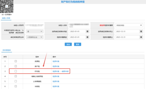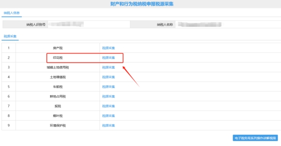 三、進入“財產和行為稅納稅申報稅源采集”模塊后,點擊“印花稅”后方【稅源采集】。