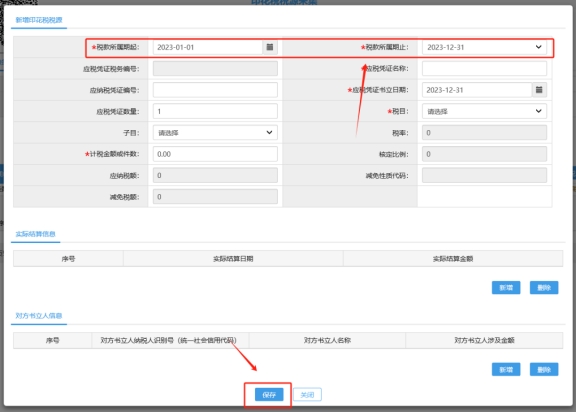 【財產和行為稅合并申報】界面點擊【填寫申報表】,選擇【財產和行為稅稅源采集】,進入“財產和行為稅納稅申報稅源采集”模塊后,點擊“印花稅”后方【稅源采集】,進入印花稅稅源采集界面,先點擊【按期申報】,再點擊右上角【新增按期申報稅源】,在此界面填寫稅源信息,其中稅款所屬期選擇2023年1月1日至2023年12月31日,帶*項為必填項,需根據自身情況填寫相關數據,必填信息全部填寫完成點擊【保存】,系統提示保存成功后點擊【確定】即可;