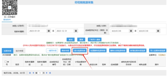 新增稅源信息保存成功后系統自動返回按期申報界面,根據查詢條件,選擇稅款所屬期2023年1月1日至2023年12月31日后點擊【查詢】,查到信息后勾選當前需要申報的稅源信息后點擊右上【提交稅源信息】,提示提交稅源信息成功后點擊【確定】。
