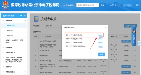 答、您好,請您點擊【我要辦稅】—【稅費申報及繳納】—【按期應申報】—【財產和行為稅合并申報】