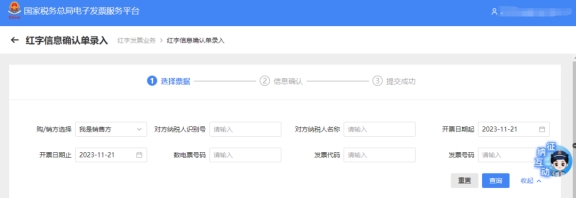 四、紅字發票確認信息錄入頁面,查詢到發票信息并選擇,進入后選擇沖紅的發票類型,核對下方帶出的發票信息與對應發票號碼代碼,確認無誤點擊【提交】提示提交成功;若銷方開具購方未認證,則會提示本次無需進行確認的字樣,點擊提示界面的【去開具】就會跳轉到紅字開具界面,核對無誤后繼續開紅字(負數)發票。