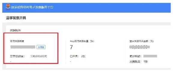您也可以進入【開票業務】--【藍字發票開具】界面,在數據概覽部分也能對發票總額度和可用發票額度進行查看。