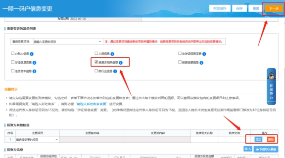 三、一照一碼戶登記信息變更頁(yè)面,在此界面勾選“投資方相關(guān)信息”系統(tǒng)會(huì)帶出變更項(xiàng)目,請(qǐng)您自行增加或刪除修改,完成后點(diǎn)右上角下一步提交即可。