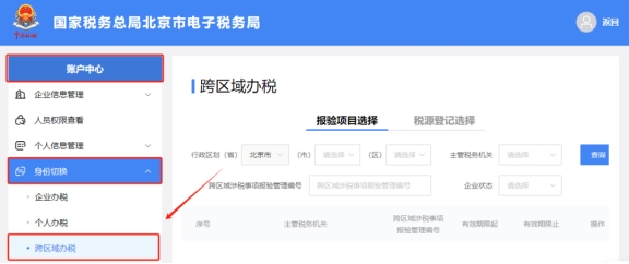 通過電子稅務局網頁端“企業業務”下的“特定主體”入口直接登錄,登錄進電子稅務局(注:企業身份下的三員(法定代表人、財務負責人、辦稅員)及《跨區域涉稅事項報告表》中的經辦人、聯系人可從,鼠標移至右上角“項目切換主管稅務機關”),點擊即可切換具有關聯關系的跨區域報驗戶、跨區稅源登記納稅人身份。