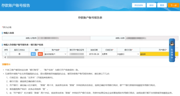 點擊【我要辦稅】—【綜合信息報告】—【制度信息報告】—【存款賬戶賬號報告】填寫存款賬戶賬號報告表時,請注意以下幾點: