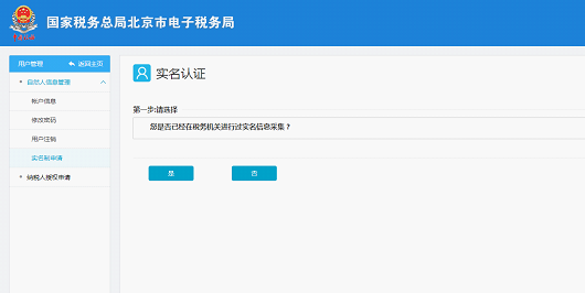 7.? 納稅人點擊“確定”按鈕后,進入實名認證界面,出現選擇提示“您是否已經在稅務機關進行過實名信息采集”,點擊“是”進入關聯實名信息界面;點擊“否”進入立思辰人臉識別驗證界面;