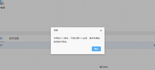 6.? 系統首先彈出“未綁定個人身份,不能辦理個人業務”的提示信息。納稅人可點擊“確定”按鈕。