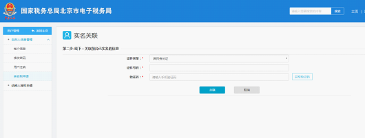 8.? 納稅人點擊“是”,進入實名關聯信息界面,選擇相關信息填寫后,進行信息驗證后,點擊“關聯”按鈕。
