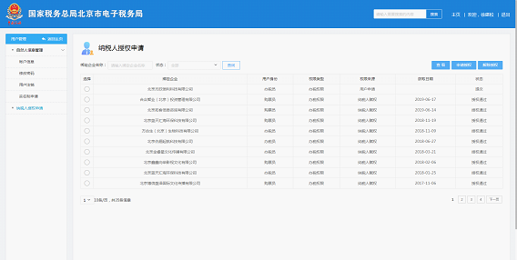 1)? 個人身份登錄電子稅務局后,打開納稅人授權申請,在綁定企業名稱中輸入需要綁定的企業名稱,點擊查詢。選定需要綁定的企業,點擊“申請授權”按鈕。