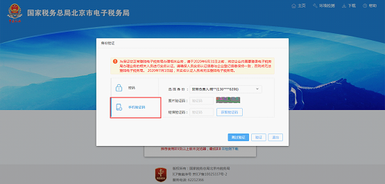 2.? 選擇手機驗證碼登錄,輸入圖片驗證碼,點擊“獲取驗證碼”按鈕,短信平臺會向該人員實名認證時登記的手機號發送驗證碼信息;輸入短信驗證碼,點擊“驗證”按鈕,即可進入電子稅務局首頁界面;