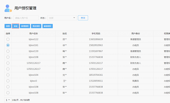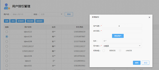 11.????? 企業授權:納稅人還可進行新增授權操作,輸入用戶信息和手機號碼,查詢出需要授權的相關用戶,選擇用戶身份,點擊授權即可。
