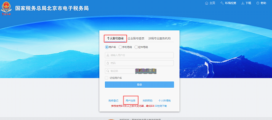 1.? 納稅人進入北京市電子稅務局系統,點擊“用戶注冊”按鈕,進行用戶注冊;